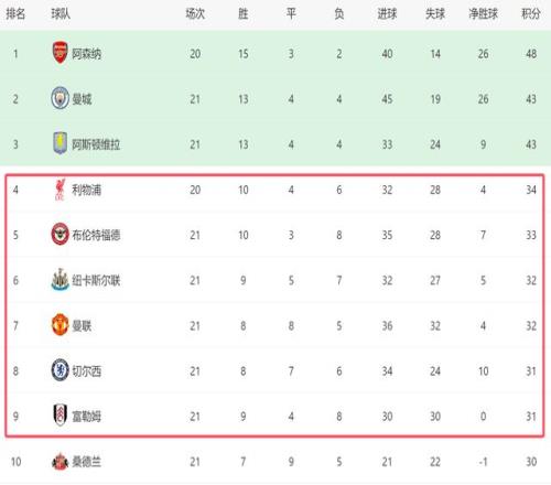 北京时间1月8日,英超第21轮激战连场,结果曼联和切尔西2大豪门全部不胜,他们的排名也被纽卡斯尔和布伦特福德反超,这一夜过后,英超争四的形势发生了巨大的变化。