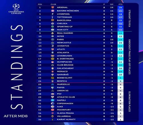 本场比赛过后,我们在欧冠联赛阶段的最终排名为第11。接下来,球队将在淘汰赛附加赛阶段中面对位列第21的摩纳哥或是第22的卡拉巴赫。
